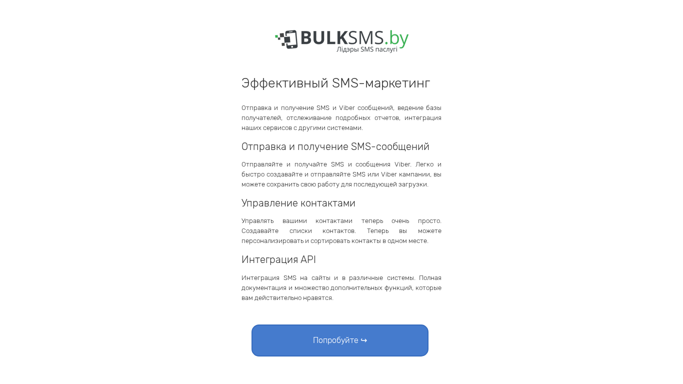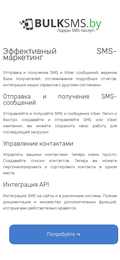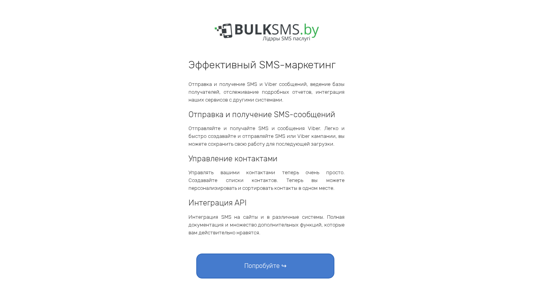 | AI-анализ | --- This online resource, BULKSMS.by, focuses on providing an effective SMS marketing solution with the capability to send and receive SMS and Viber messages. Users can manage a database of recipients, track detailed reports, and integrate the service with other systems. The site offers features for sending and receiving SMS and Viber campaigns, allowing users to save their work for future uploads. Contacts are easily managed through the creation and organization of contact lists. The platform also includes an API for website and system integration, accompanied by comprehensive documentation and additional functions. |
