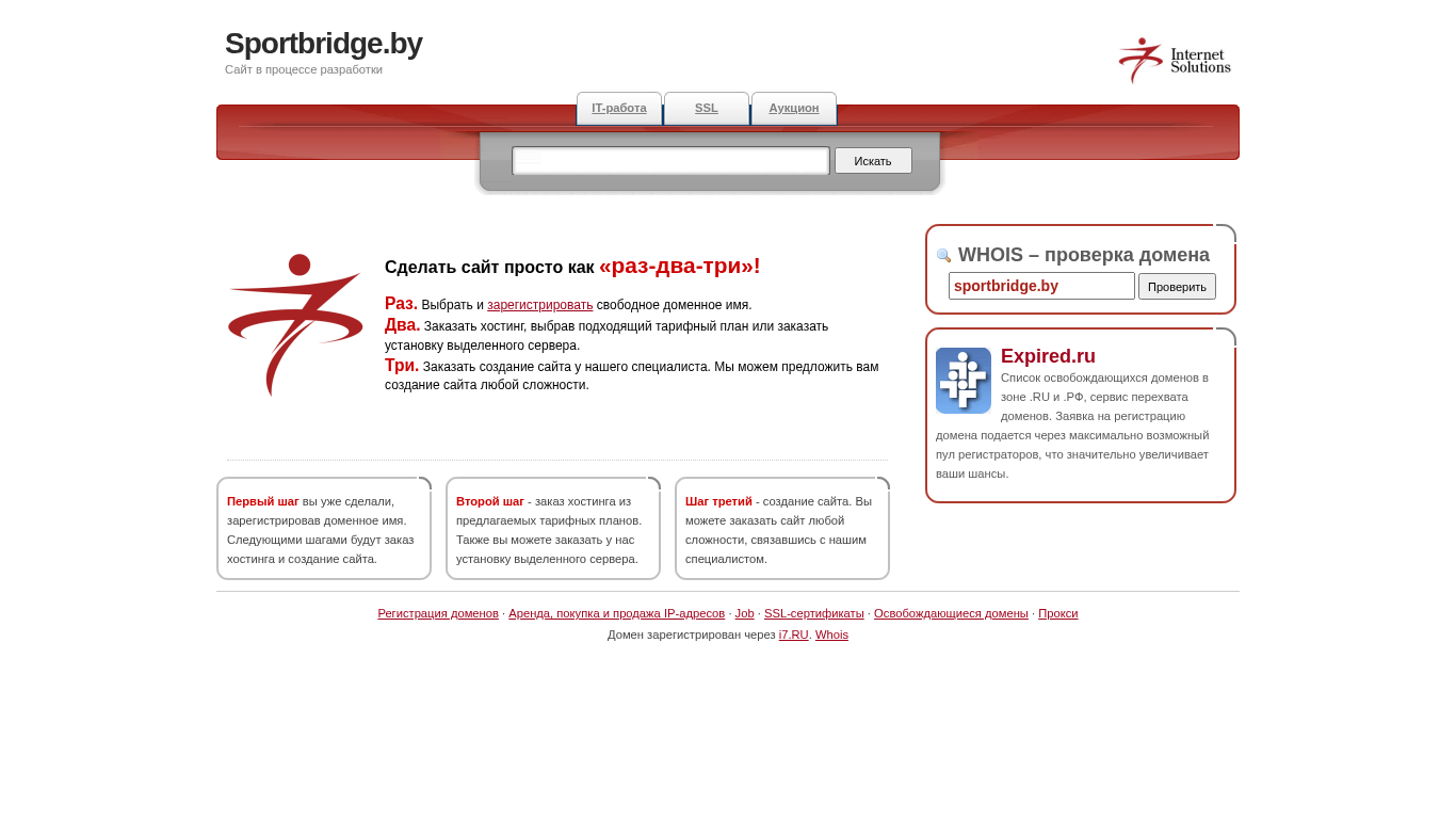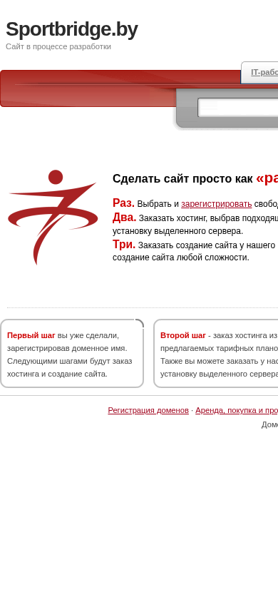 | AI-анализ | The portal Sportbridge.by is a domain registration and website creation service. Users can register a free domain name, order hosting, and commission the creation of a website through the platform. The process is broken down into three steps: selecting and registering a domain name, ordering hosting, and creating the website. The service offers various tariff plans for hosting and the option to purchase a dedicated server. Users can also register domains through i7.RU and check their status using the Whois service. |