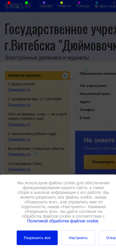 | AI-анализ | The website is a state educational institution called "Detsky sad № 21 g.Vitebska Duymovochka" (Children's Garden № 21 in Vitebsk Duymovochka). It informs users about the use of cookies on the website for site functionality and data collection and analysis. Users can either accept all cookies or manage them individually. The website also provides a link to its cookie policy and a list of cookies with their descriptions and retention periods. The domain is a subdomain of Schools.by. |
