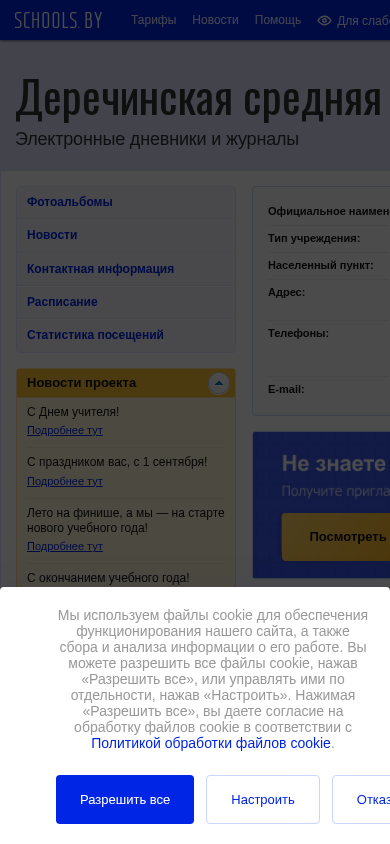 | AI-анализ | The website "Деречинская средняя школа" (Derechin Middle School) is a Belarusian .BY domain, which uses cookies for the functioning of the site and data collection and analysis. Visitors can allow all cookies or manage them individually through the site's cookie policy. Functional cookies, which are necessary for the site to function, cannot be disabled. Statistical cookies, set by third-party web analytics tools, can be used to gather data on user interests, visited pages, and traffic sources to improve the site's performance. The site's title is "Деречинская средняя школа" and it is currently configured with a black-on-white color scheme, disabled images, and the use of the Arial font. |
