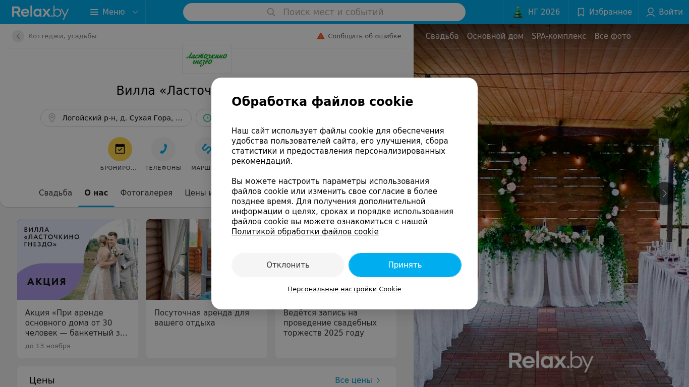 | SEO-описание | Вилла Ласточкино гнездо в Логойском районе– цены за проживание, отзывы, адрес на карте, возможность забронировать коттедж/агроусадьбу на сутки Ласточкино гнездо онлайн на Relax.by |