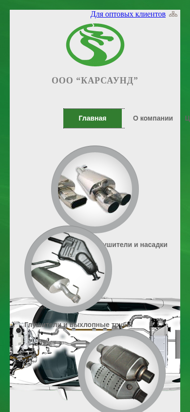 | SEO-описание | Компания «Карсаунд» с 1993 года занимается оптовой продажей элементов выхлопных систем автомобилей: прямотоки, насадки на глушители, резонаторы, пламегасители, катализаторы, гофры, прокладки и элементы подвесок |