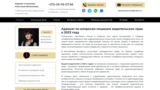 | SEO-описание | Адвокат по лишению прав за алкоголь в Минске. Адвокат 18.15 КоАП. ⭐️ Адвокат Степанова А. В. ⭐️ Опыт 10+ лет по 18.15 КоАП. ⚡️ Обжалование лишения водительских прав. ☎️ Нужна помощь? Звоните: +375(29) 116-07-66 |