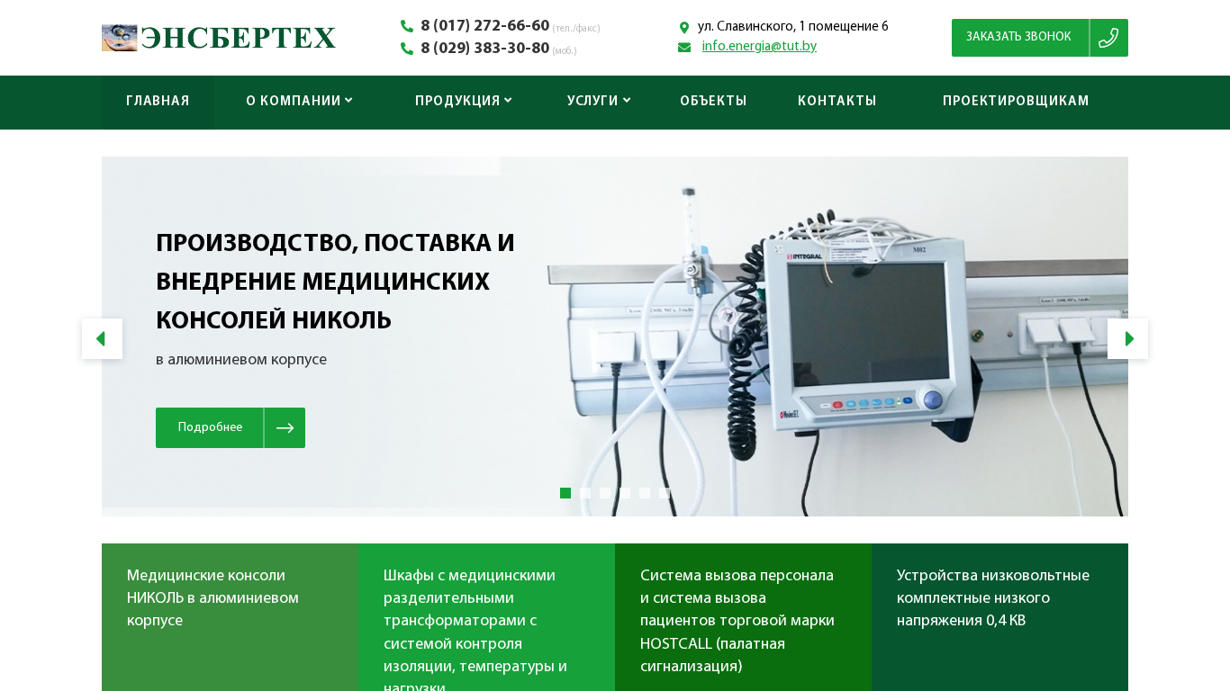 | SEO-описание | Разрабатываем, производим и поставляем электротехническое оборудование на территории EAC согласно требованиям заказчика. Медицинские консоли под торговой маркой НИКОЛЬ, Электрощитовое оборудование низкого напряжения, Шкафы безопасного питания и др. |