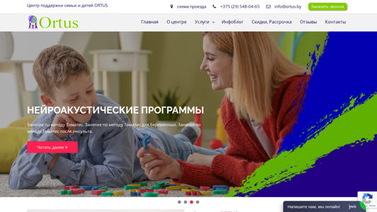 | SEO-описание | Добро пожаловать на официальный сайт Центра поддержки семьи и детей ORTUS. В нашем центре применяются самые современные методики коррекционных занятий. Интегрировано самое новейшее Инновационное оборудование (Tomatis® и ForBrain), методики для достижения наибольшего и скорейшего результата, а также для того, чтобы была возможность проводить коррекционную работу даже с самыми тяжелыми детьми. |