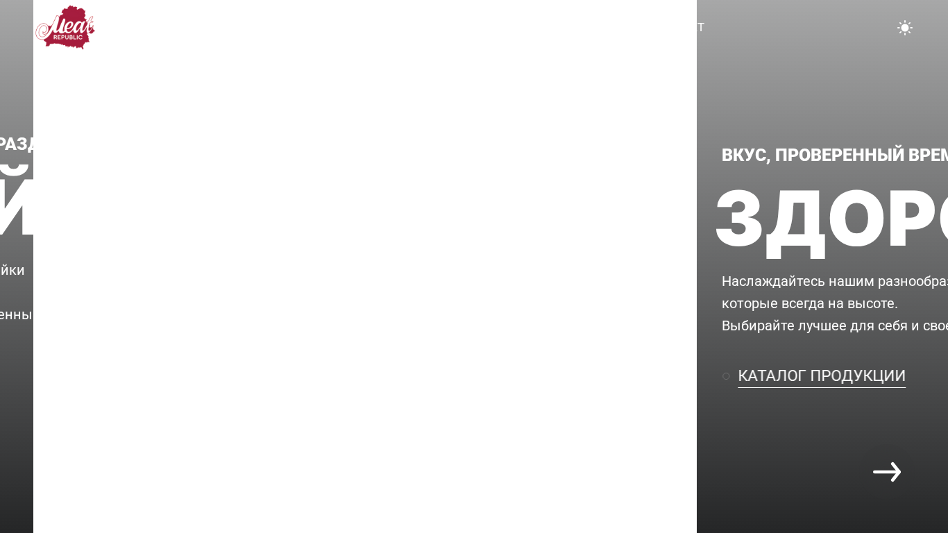 | SEO-описание | Добро пожаловать в Meat Republic! Откройте для себя ассортимент колбас, сосисок, ветчин и рулетов из индейки. Натуральные и вкусные продукты для всей семьи. |