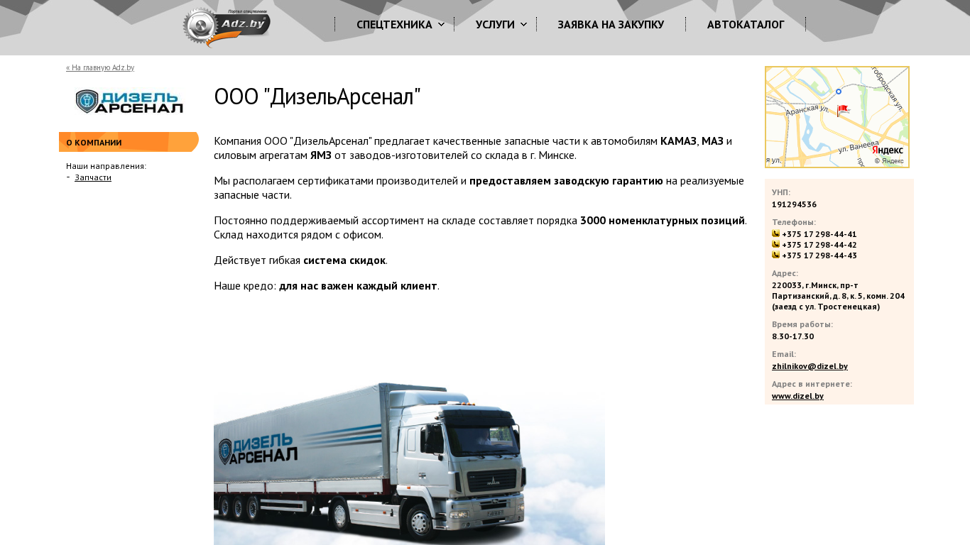 | Адрес | г.Минск, пр-т Партизанский, д. 8, к. 5, комн. 204 (заезд с ул. Тростенецкая)'; org = 'ООО "ДизельАрсенал"'; |