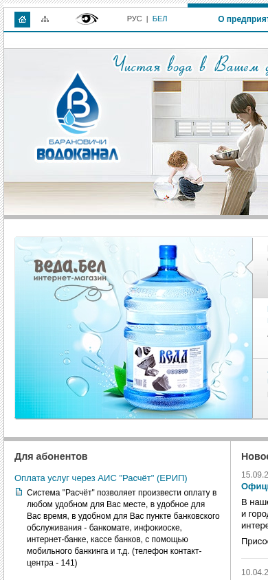 | SEO-описание | Официальный сайт КУПП «Водоканал» г.Барановичи. Информация для абонентов, а также услугах водоканала, телефоны служб |