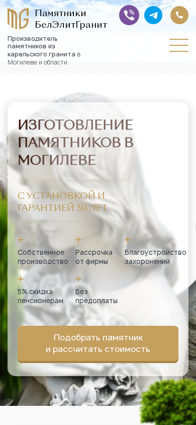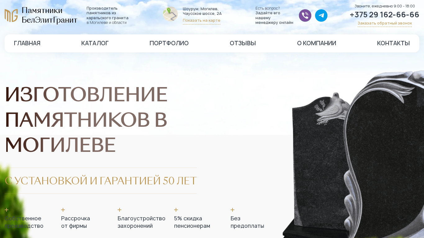 | SEO-описание | Изготовление памятников в Могилеве по цене от производителя с гарантией. Установка и доставка. Благоустройство под ключ. Рассрочка от фирмы. |