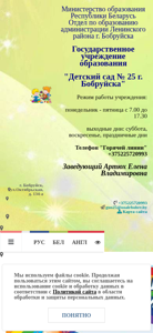 | AI-анализ | The website is for Kindergarten No. 25 in Bobruisk, Belarus, managed by the Ministry of Education of the Republic of Belarus and the Education Administration of the Leninsky District of Bobruysk City. It is a state educational institution named "Kindergarten No. 25 in Bobruysk City". The kindergarten operates from Monday to Friday, 7:00 am to 5:30 pm, with weekends and holidays off. Contact information includes a phone number for the "Hotline" and the contact details of the head, Elena Vladimirovna Artiukh, located on October Street, house 134-a in Bobruysk. The website features a site map, work schedules for management, information on administrative procedures, and contacts, including a telephone directory and a licensing section. It also includes information on normative legal |