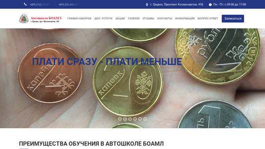 | SEO-описание | Воспользовавшись услугами автошколы БОАМЛ, Вы подготовитесь к тому, чтобы сдать на права в Гродно и получить водительское удостоверение категории B по выгодной цене. Звоните: ☎+375 (29) 868-60-94 |
