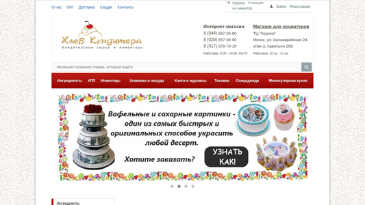 | SEO-описание | Хлеб Кондитера - кондитерское сырье, инвентарь и упаковка с доставкой по всей Беларуси |