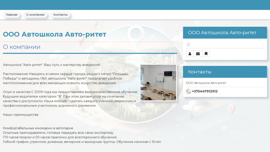 | SEO-описание | ООО Автошкола Авто-ритет - г. Минск, ул. Чапаева, д. 3, каб. 1-67, +375447912912 |