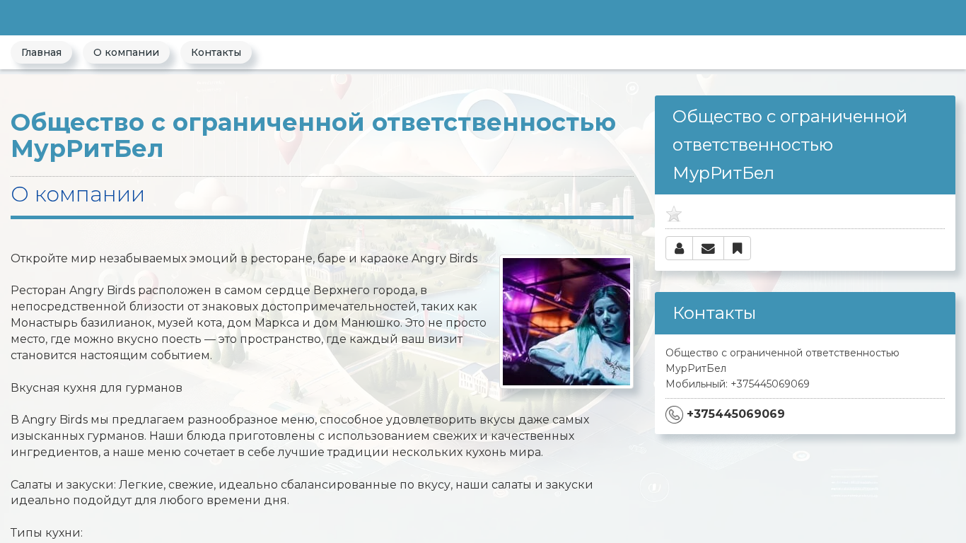 | SEO-описание | Общество с ограниченной ответственностью МурРитБел - г. Минск, ул. Интернациональная, д. 25А, пом. 1, +375445069069 |