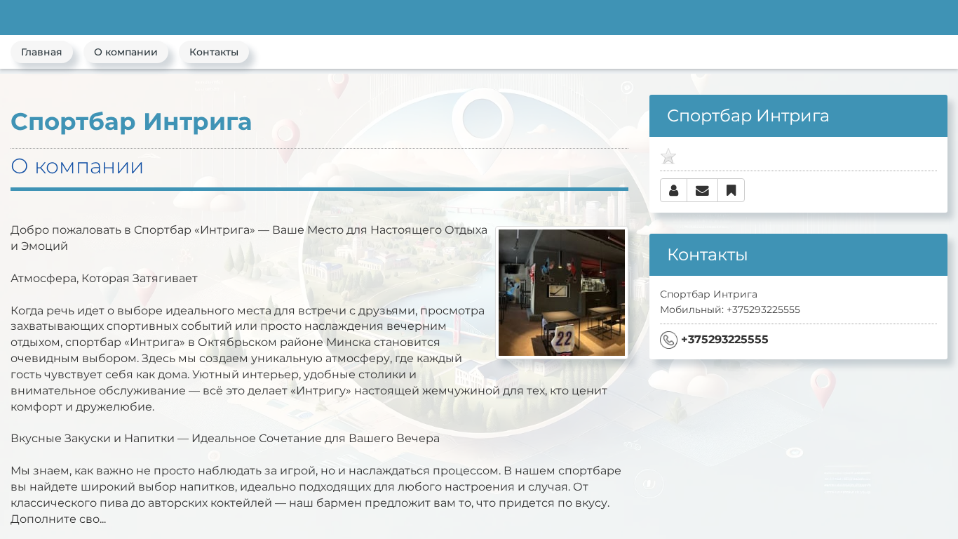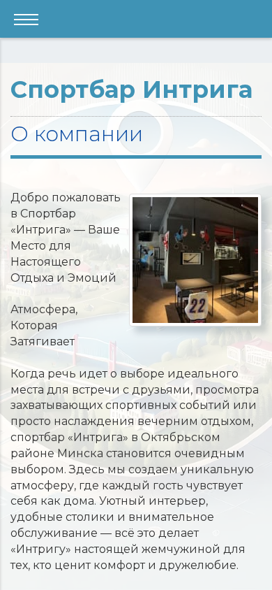 | SEO-описание | Спортбар Интрига - Минск, ул. Казинца, 122, +375293225555 |