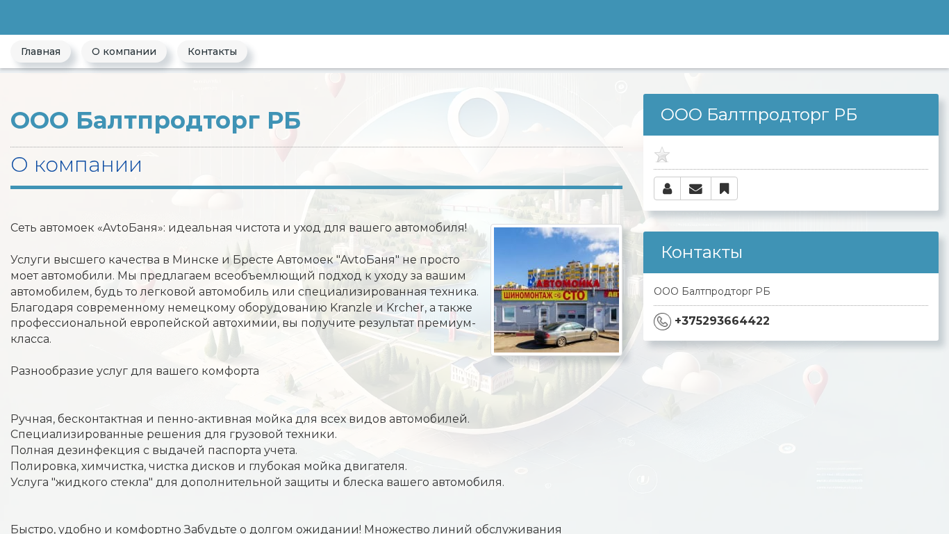 | SEO-описание | ООО Балтпродторг РБ - г.Минск,ул.Ольшевского,20 (здание автомойки), +375293664422 |