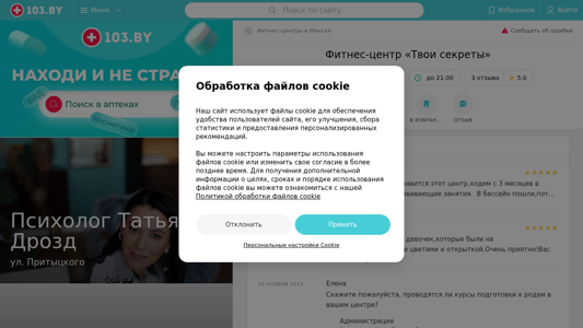 | SEO-описание | Фитнес-центр Твои секреты Минск ул. Притыцкого 83 – телефоны, время работы, отзывы и схема проезда в каталоге медицинского портала 103.by. |