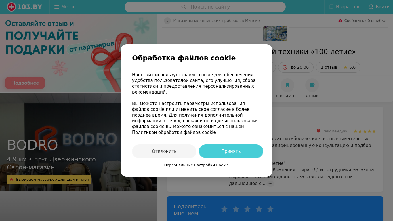 | SEO-описание | Магазин медицинской техники 100-летие Минск ул. Каролинская 2 – телефоны, время работы, отзывы и схема проезда в каталоге медицинского портала 103.by. |