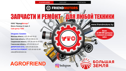 | SEO-описание | ООО «ФрэндМоторс» - продажа запасных частей через интернет в Минске на любой вид транспорта как импортного, так и отечественного производства: грузовой, сельскохозяйственный, легковой, промышленное оборудование и даже водный и мото-транспорт. |