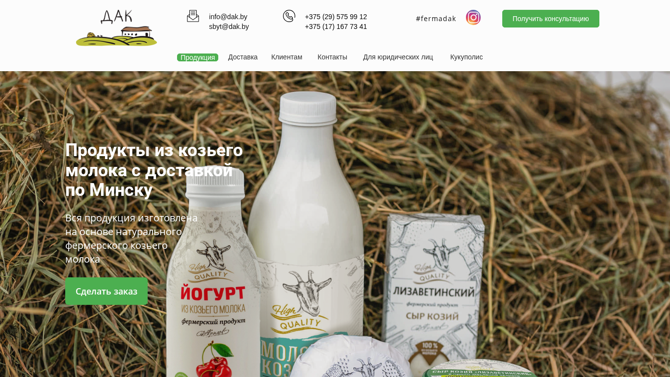 | AI-анализ | Описание: Колхоз «ДАК» в Минске продает молочные продукты, изготовленные из козьего молока. Продукция включает в себя козье молоко, козье сир, козье йогурт и козье молоко для детей. Доставка ферментированного козьего молока доступна в Минске и по всей Беларуси. Ключевые слова: козье молоко Минск, козье молоко товары, купить козье молоко, козье йогурт Минск, козье сир, молоко для детей, ферментированное козье молоко, козье молоко ценность, корзина, покупка. Домен: dak.by Farm "DAK" in Minsk sells dairy products made from goat milk. The product range includes goat milk, goat cheese, goat yogurt, and goat milk for children. Delivery of fresh goat |