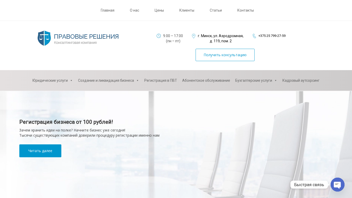 | SEO-описание | Консалтинговая компания Правовые Решения оказывает полный спектр услуг в Минске: юридические услуги, бухгалтерский учет, устный и письменный перевод, кадровый аутсорсинг, услуги адвоката. Профессионально и недорого оказываем юридические услуги для бизнеса и физических лиц в Беларуси |