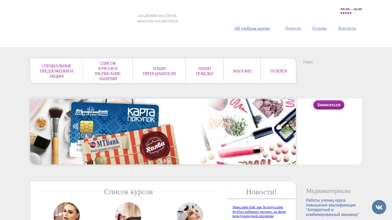 | SEO-описание | Академия мастеров красоты "Далидович" оказывает первоклассный уровень обучения по следующим направлениям: маникюр и педикюр, наращивание и дизайн ногтей, депиляция, визаж, наращивание ресниц и оформление бровей |