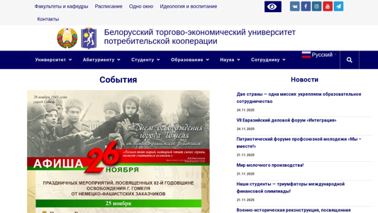 | AI-анализ | The portal is the website of the Belarusian State Trade and Economic University of Consumer Cooperatives (Белорусский торгово-экономический университет потребительской кооперации, BTEU). The homepage contains information about the university, its specialties, and upcoming conferences. The design features a header image with an overlay and a navigation menu. The main content is organized in sections, including a slideshow, university news, and a library for students. The website is optimized for search engines, with metadata indicating the name, URL, and organization type of the university. The language is set to Russian. The website was last modified in November 2025. |