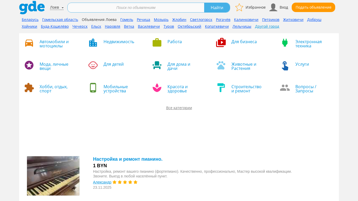 | SEO-описание | Gde.by - популярная доска бесплатных частных объявлений Лоева. На нашем сайте Вы найдете актуальные объявления от частных лиц и деловых организаций Лоева. Любой желающий может подать собственное объявление абсолютно бесплатно. |