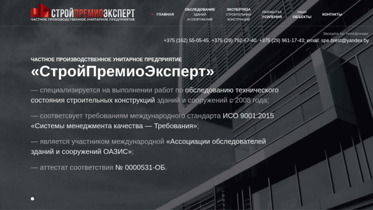| AI-анализ | The web project "СтройПремиоЭксперт" (expertspe.by) is a private production enterprise based in Brest, Belarus, specializing in building inspections of structures and construction elements of various buildings and structures since 2008. The company adheres to the requirements of the international quality management system ISO 9001:2015 and is a member of the International Association of Building Inspectors OAZIS. The services provided include the examination of construction elements in industrial, residential, public, and agricultural buildings and structures at all stages of construction and operation. Clients include a trolleybus park in Brest, a church in the village of Novy Dvor in the Shchucin district, and the SantaBremor office building. The company guarantees objectivity, independence, and quality in the execution of its inspections |