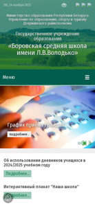 This online resource is the official website of Borovskaya Middle School named after L.V. Volodko located in Belarus. The keywords associated with the website include 'school', 'education', 'news', and 'calendar'. The top words on the website are 'detailed', '2025', 'Borovskaya', 'Belarus', 'November', and 'calendar'. The website features a section for school news and a calendar of upcoming events. It also includes a map and information about the school's schedule and work hours. The website design is modern with a dark color scheme and a clean layout. The domain is registered under the .BY top-level domain for Belarusian websites.