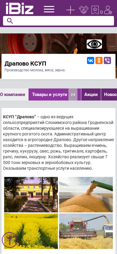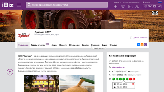 | AI-анализ | The website is for Drapovo KSUP, a farming enterprise located in the village of Drapovo, in the Slohimsky district of Grodno region, Belarus. The company specializes in livestock farming, particularly raising cattle, and also engages in crop farming. Crops grown include cereals such as wheat, barley, oats, and rye, as well as legumes like peas and lupins, and root crops like potatoes and rapeseed. The enterprise produces and sells meat from cattle, milk, cereals, rapeseed, and corn. The total land area of the farm is 6,598 hectares, with 6,080 hectares dedicated to agricultural use and 5,327 hectares used for arable farming. The farm has a milk processing plant, a meat processing plant, grain drying facilities |