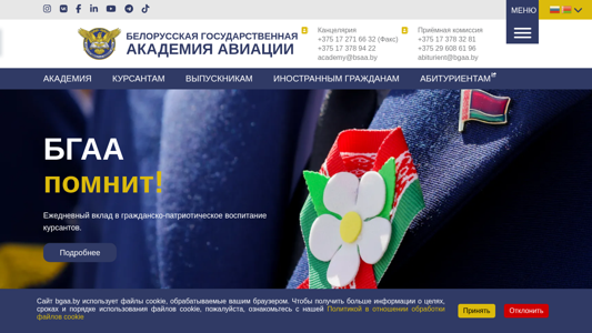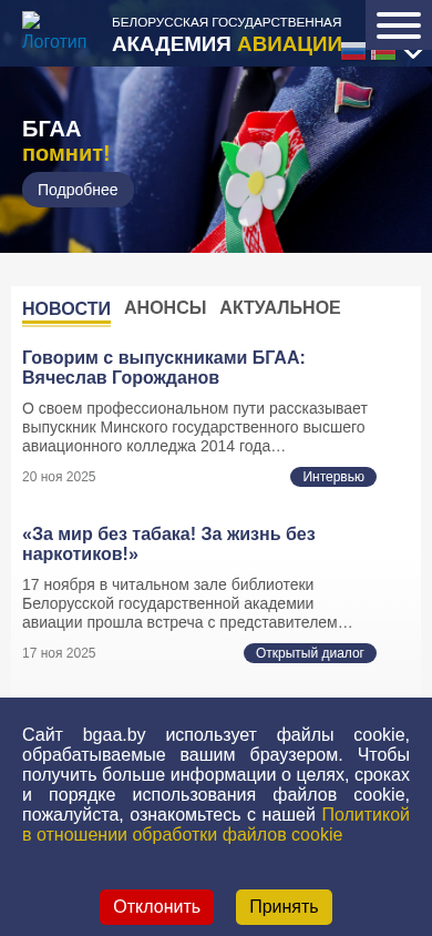 | SEO-описание | БГАА является одним из ведущих учреждений образования Республики Беларусь по подготовке специалистов авиационной отрасли, осуществляет обучение по специальностям общего и углубленного высшего образования, специальностям среднего специального образования, специальностям аспирантуры. |