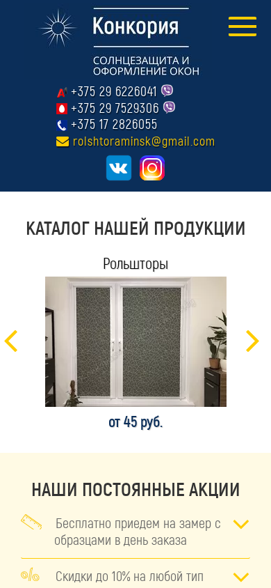 | SEO-описание | Ролшторы и жалюзи любых размеров на заказ в Минске. Бесплатный замер и монтаж, большой выбор образцов от компании Конкория. Доставка и установка жалюзи и рулонных штор по низким ценам. Фото работ. |