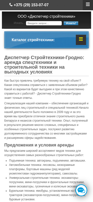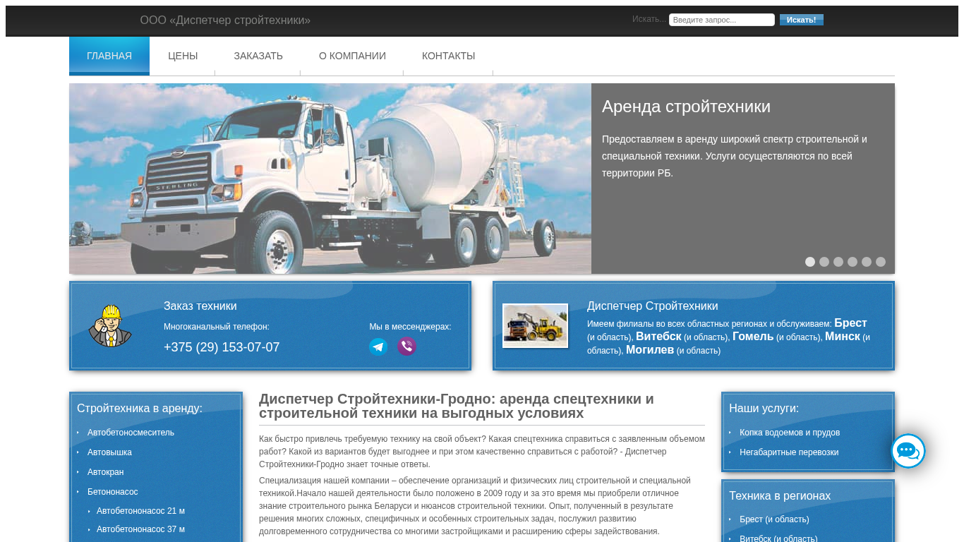 | SEO-описание | Аренда строительной и спецтехники в Гродно ▶️ Большой парк техники. Оперативная доставка на объект. Низкие цены. Любой срок. Скидки при долгосрочной аренде ☎️ +375 29 153-07-07 |