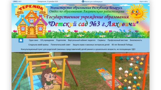 | AI-анализ | The portal is a website for the state educational institution "Jasly-sad #3" in Liaхоvichi, Belarus. It provides information on the kindergarten's schedule, administrative procedures, contacts, conditions for admission, structure, leadership, pedagogical staff, normative legal documents, photo-video gallery, history, psychological services, special education, nutrition, patriotic education, routines for outings, information about the UMK "My first lessons," parent councils, consultations for parents, and various services. The site includes sections for announcements, the institution's brochure, a safe route map, and a consultative point for parents of children not attending the kindergarten. Additionally, it features forms for methodological work, a methodical depository for specialists, and certification information. The educational process, methodological associations, and effective pedagogical practices are also |