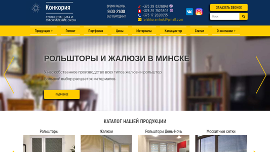 | SEO-описание | Ролшторы и жалюзи любых размеров на заказ в Минске. Бесплатный замер и монтаж, большой выбор образцов от компании Конкория. Доставка и установка жалюзи и рулонных штор по низким ценам. Фото работ. |