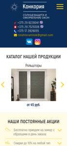 | AI-анализ | --- The portal rolshtora-minsk.sunprotect.by offers rollshades and blinds for sale in Minsk. Custom orders for rollshades and blinds of various sizes are available with free measurement and installation. The company Konkoria provides a wide range of samples. Delivery and installation of rollshades and roller blinds at low prices. Photos of completed projects are available. The site includes a calculator for the cost of Roman shades, blinds, and rollshades, as well as contact information and testimonials. The company offers various types of rollshades, including free-hanging, on balconies, and cassette models. There are also various types of blinds, such as vertical and horizontal, aluminum and plastic, and figurative ones. Additionally, the site offers various types of mosquito nets, plisse, and car |