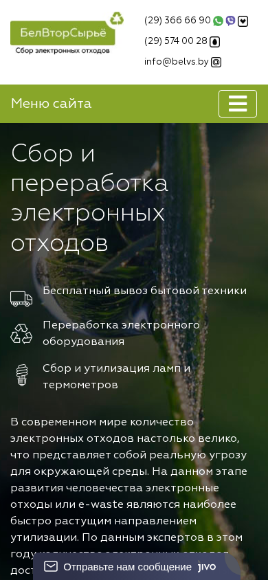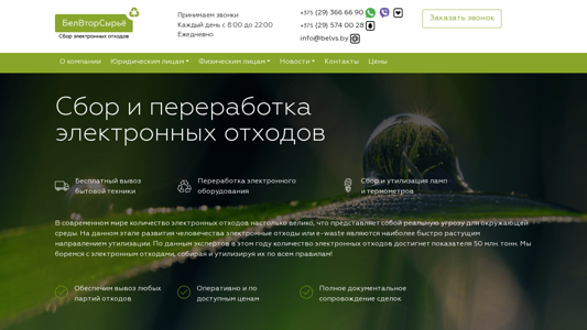 | AI-анализ | language: ru The web project "Collection and Processing of Electronic Waste in Minsk" focuses on collecting and processing electronic waste in the city of Minsk, Belarus. The website offers low prices and promises to handle the removal of waste themselves. A full package of documents is required for orders. The project accepts phone calls daily from 8:00 to 22:00, with contact numbers +375 (29) 366 66 90 and +375 (29) 574 00 28, and email inquiries to info@belvs.by. The site includes sections on the company, processing of electronic equipment for legal entities, and uptake of electronic equipment from individuals, as well as free collection of old technology and scrap metal. The project also offers services for the evaluation of technical condition, dispos |