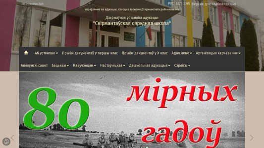 | AI-анализ | The portal 'Скірмантаўская сярэдняя школа' (Skirmantauskaya siarednaya shkola) is a Belarusian educational website primarily focused on the 'образования' (education) sector. The website's description includes keywords related to 'адукацы' (education), 'подробнее' (details), 'деятельность' (activity), 'деятельности' (activities), 'ноября' (November), '2025', and various Belarusian phrases such as 'пры' (in), 'карта' (map), 'арган' (school), 'прав' (laws), 'кодекса' (codes), 'республики' (republic), and 'беларусь' (Belarus). It uses the script |
