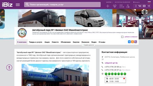 | AI-анализ | This website is a branch of OAO Minoblavtotrans, located in Soligorsk, Belarus, along Lubanskoje Shosse 22. The company specializes in passenger transportation within Belarus and internationally using comfortable buses, including Iveco Irisbus, МАЗ, and ГАРЗ models. Additionally, they offer cargo transportation services using MAN T6X, МАЗ-5440, МАZ-5516, МАZ-6501, and КАМАЗ-6520 trucks. The website includes a route map, contact telephone numbers, and the address of the company, Autobusny Park №1 Filial OAO Minoblavtotrans. 223710, Soligorsk, Lubanskoje Shosse, 22 |