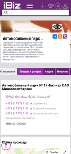 | Название / Заголовок | Автомобильный парк № 17 Филиал ОАО Миноблавтотранс - Городские и пригородные автобусные перевозки. Грузовые автомобильные перевозки по территории РБ, странам СНГ, странам Европы. Техническое обслуживание и ремонт автомобилей. Почасовые заказные перевозки. Сдача внаем собственного недвижимого имущества.. 222666, Столбцы, , Якуба Коласа, 96 |