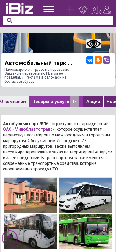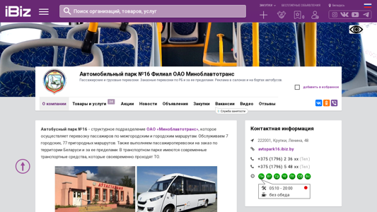 | Название / Заголовок | Автомобильный парк №16 Филиал ОАО Миноблавтотранс - Пассажирские и грузовые перевозки. Заказные перевозки по РБ и за ее пределами. Реклама в салонах и на бортах автобусов.. 222001, Крупки, , Ленина, 48 |