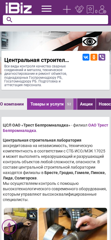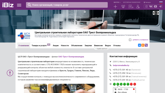 | AI-анализ | The web project "Central Construction Laboratory OAO Trust Belpromnaladka" offers a range of services including quality control of welding connections and metals, technical diagnostics and repair of objects under the supervision of the State Committee for Standardization, Metrology and Certification of Belarus (Gospromnadzor RB, Gosatomnadzor RB), as well as personnel training and certification. The company's address is 220013, Minsk, Hmeльnicкаго, 8. Their services include non-destructive and destructive testing of objects of various complexities and hazard levels, using advanced modern equipment operated by highly qualified specialists. The laboratory is accredited for independence and technical competence according to the STB ISO/IEC 17025 standard and has branches in Brest, Grodno |