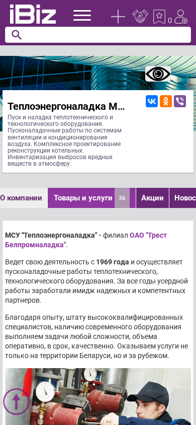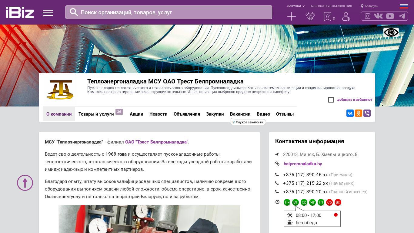 | AI-анализ | language: ru This website is for the division "Теплоэнергоналадка" of the Belarusian company ОАО "Трест Белпромналадка". The division specializes in the start-up and commissioning of thermal and technological equipment. It also offers consulting services for the reconstruction of boiler houses and the inventory of harmful substance emissions into the atmosphere. The company's address is listed as 220013, Минск, Б. Хмельницкого, 8. The website provides information about the company's services, which include the start-up and commissioning of ventilation and air conditioning systems, as well as comprehensive project design for boiler house reconstructions. The company offers its services both in Belarus and abroad. The website includes sections for news, announcements, vacancies, and customer reviews. The |