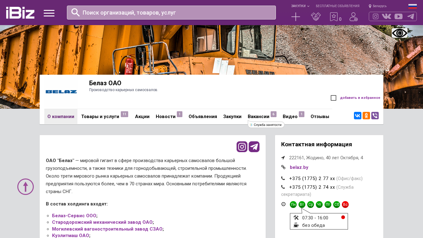 | Название / Заголовок | Белаз ОАО - Производство карьерных самосвалов.. 222161, Жодино, , 40 лет Октября, 4 |