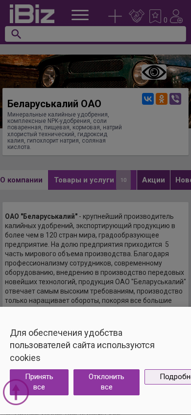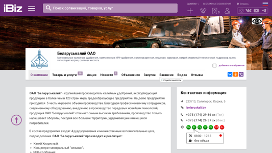 | AI-анализ | The portal kali.ibiz.by is a Belarusian company, Belarusian State Open Joint-Stock Company - Belarusian Potash Company (Беларуськалий ОАО), specializing in mineral fertilizers, complex NPK fertilizers, food-grade salts, industrial salts, technical sodium chloride, potassium hydroxide, sodium hypochlorite, and sulfuric acid. It provides information on the company, its products, and services, including free purchases and job vacancies. The company is a leading global producer of potash, exporting its products to over 120 countries, and a significant employer and community contributor in Belarus. Its product line includes potassium chloride, mineral concentrate "silvin", NPK fertilizers, NPK turcosmeises, technical sodium chlor |