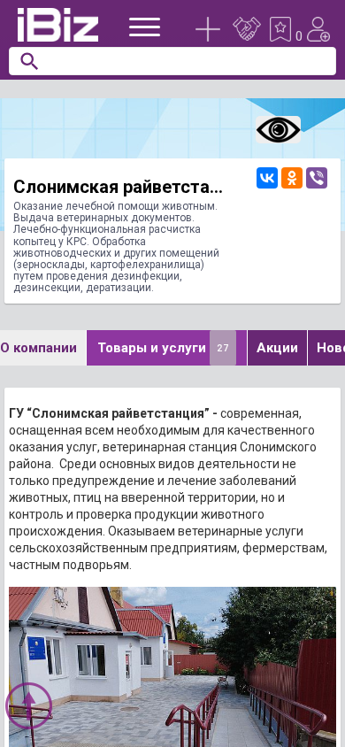 | AI-анализ | The web project "Sloнимская райветстанция ГУ" is a modern veterinary station in Sloним, Belarus, providing veterinary services for animals and birds within its jurisdiction. It also carries out control and verification of animal-derived products. The station offers veterinary services to agricultural enterprises, farms, and private households. The station's facilities include Sloнимская городская ветеринарная станция, Sloнимская районная ветеринарная лаборатория, Sloнимская лаборатория ветеринарно-санитарной экспертизы №1, Sloнимская лаборатория ветеринарно-санитарной экспертизы №2, and Жировичская участковая ветеринарная лечебница. The station conducts and organizes therapeutic and preventive measures, ensures |