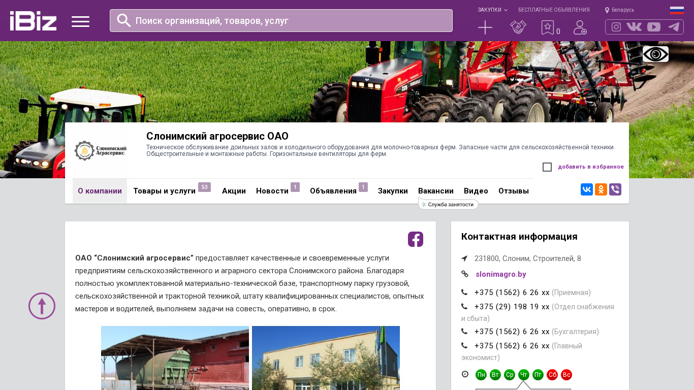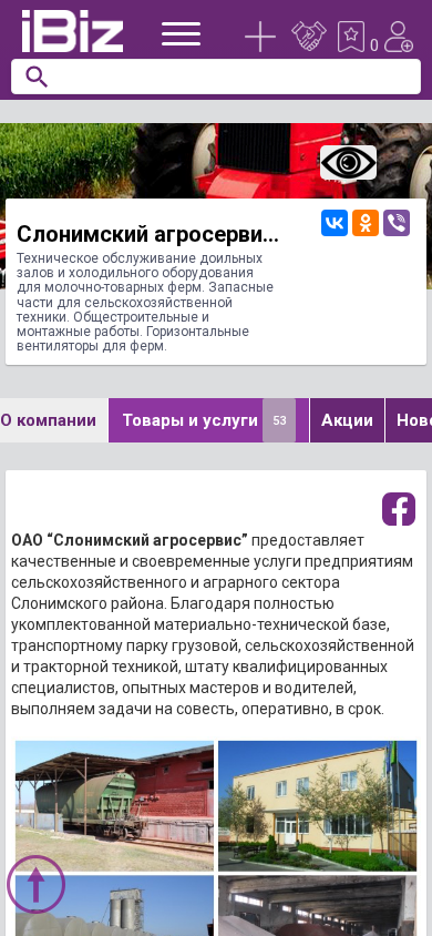 | Название / Заголовок | Слонимский агросервис ОАО - Техническое обслуживание доильных залов и холодильного оборудования для молочно-товарных ферм. Запасные части для сельскохозяйственной техники. Общестроительные и монтажные работы. Горизонтальные вентиляторы для ферм.. 231800, Слоним, , Строителей, 8 |