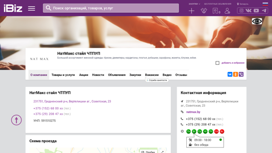 | AI-анализ | The web project NatMax style ЧТПУП is an online store specializing in women's clothing. It offers a wide range of items including jeans, jumpers, cardigans, dresses, shirts, sarafans, jackets, blouses, skirts. The company's contact details, address, and map scheme are provided. NatMax style ЧТПУП is located in the Grodno region, at the address: Sovietskaya, 23, Veretelishki AG, 231751. The phone numbers for contact are +375 (152) 68 00 xx and +375 (29) 208 47 xx. The business registration number is 591510275. The store operates from Monday to Friday, 9:00 am to |