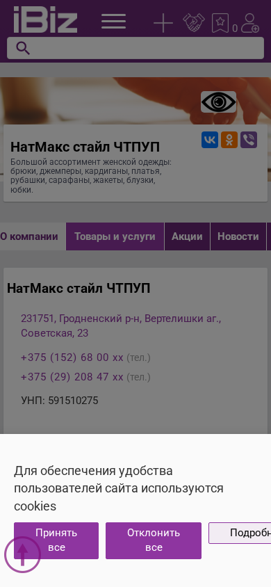 | Название / Заголовок | НатМакс стайл ЧТПУП - Большой ассортимент женской одежды: брюки, джемперы, кардиганы, платья, рубашки, сарафаны, жакеты, блузки, юбки.. 231751, , Вертелишки аг., Советская, 23 |